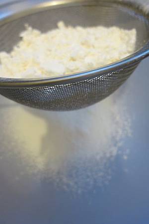 - 蛋白先用『電動打蛋器』打至起大泡,先加1次糖,再打泡,再分兩次加糖,打至蛋白泡可用打蛋器拿起能勾起角就好,不用打發得太久(