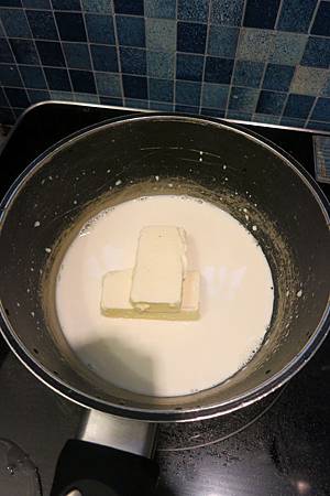 - 牛奶+**牛油+鹽+糖用小火煮至在鍋中的開始冒泡泡的狀態