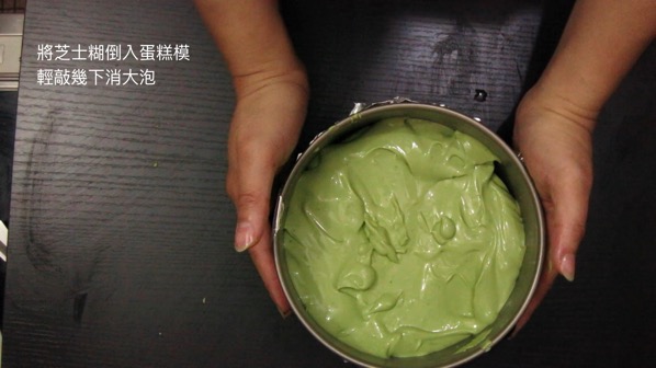 將芝士糊倒入蛋糕模,輕敲幾下消大泡再入焗爐25分鐘,出爐後待涼備用