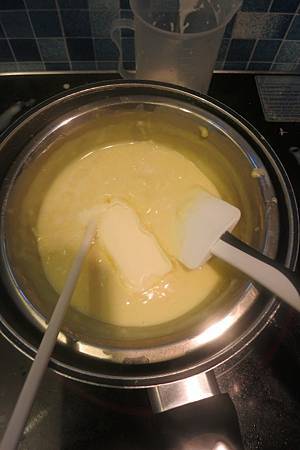 - 碗內的材料開始濃稠時,把牛油也加入煮溶攪拌