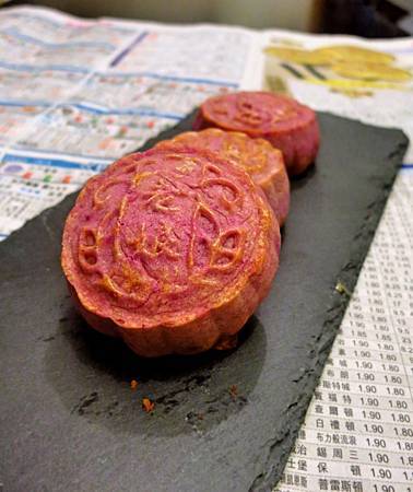 這個是兩重餡料的,外皮是紫薯皮,內餡是椰香紫薯和鹹蛋奶黃
