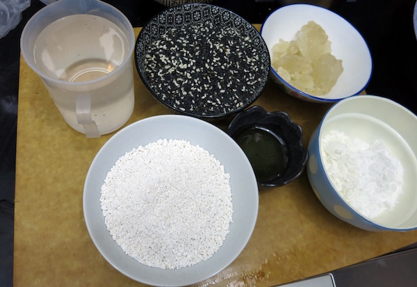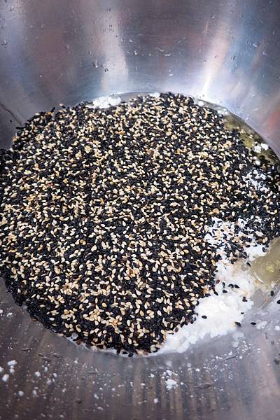 - 黑白芝麻白鑊用小火炒至看見白芝麻變成金黃色